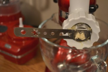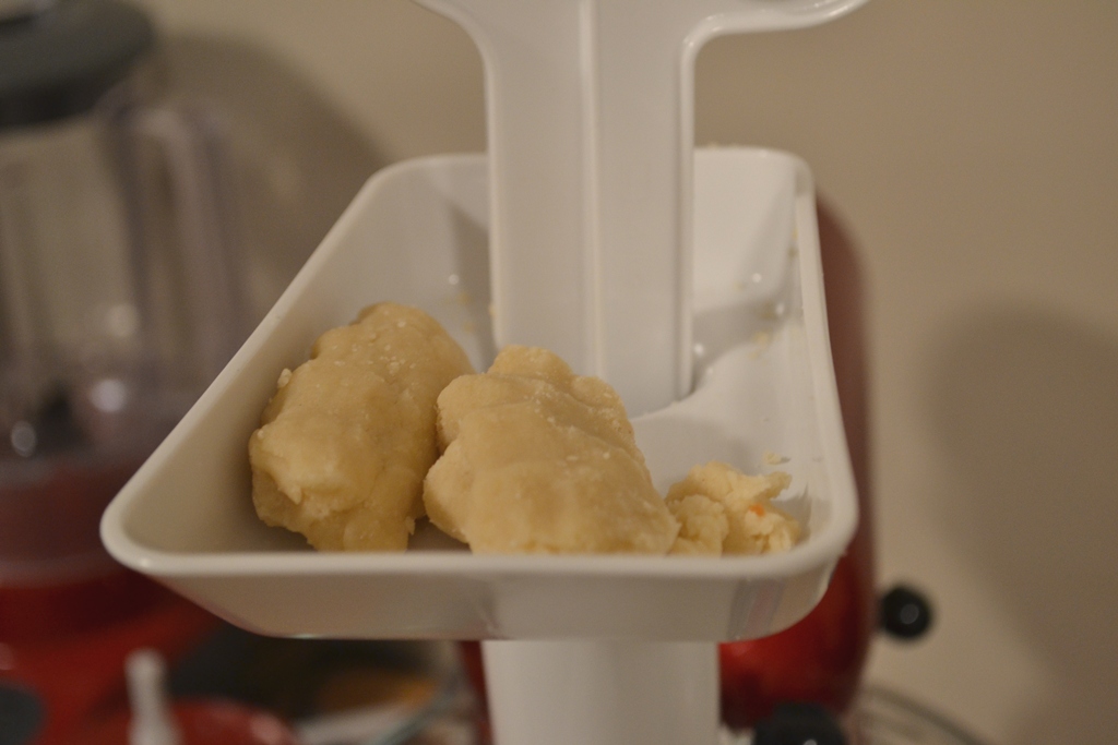 I was not sure if I would be able to make those cookies. Fortunately, my husband bought me a KitchenAid Artisan machine, which has the capability to attach a meat grinder. A quick search on Google and I found an attachment for the machine to make cookies. See pictures for reference, it is a bit difficult to describe.