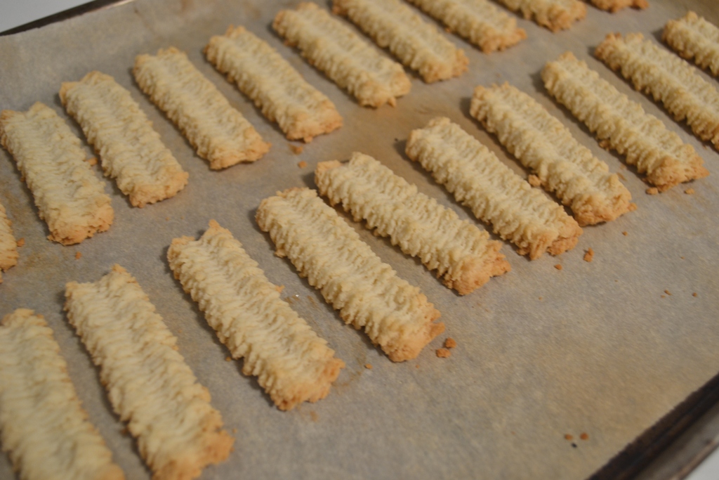 Next day, take the dough, knead it again and take small portions to use it in the meat grinder. Make the cookies as long as you like but be careful, the tend to be somewhat fragile. I found the length of my middle finger is a good size. Place them on a cookie sheet lined with baking paper. Don’t worry about rising, those cookies don’t tend to expand too much.