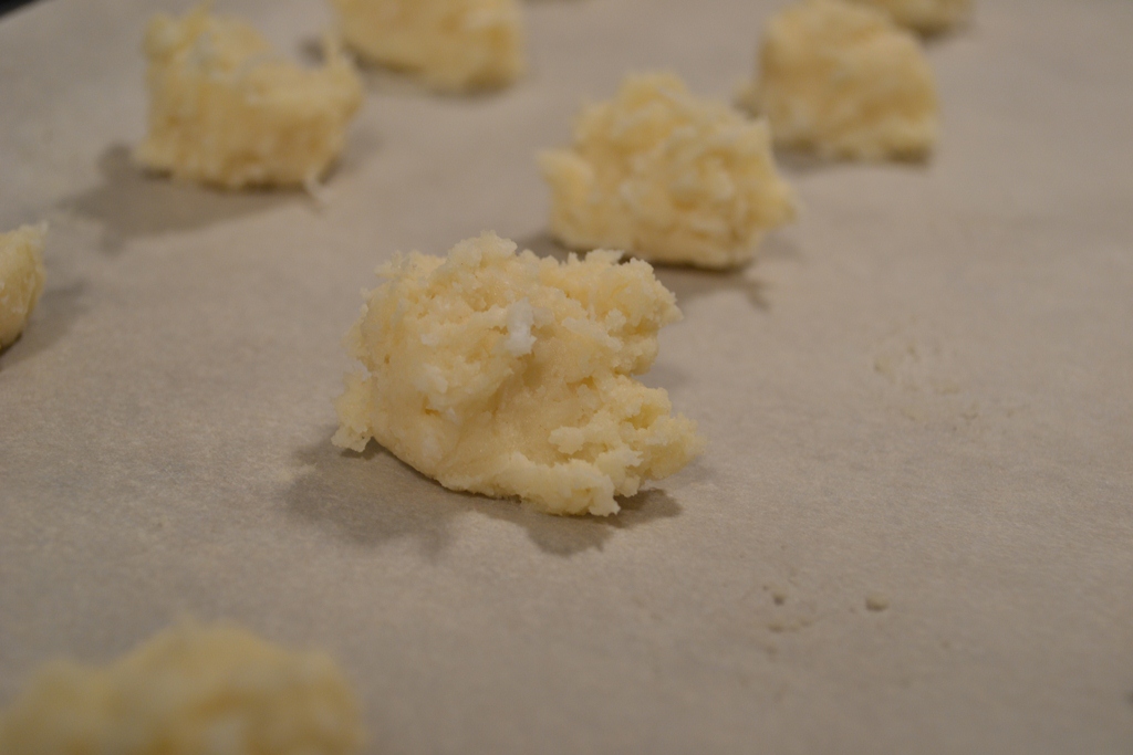 Take a teaspoon and make little heaps on the cookie sheet, which is lined with baking paper. The heaps I made spread quite a lot while baking so maybe you want to make sure there is enough spacing between them.