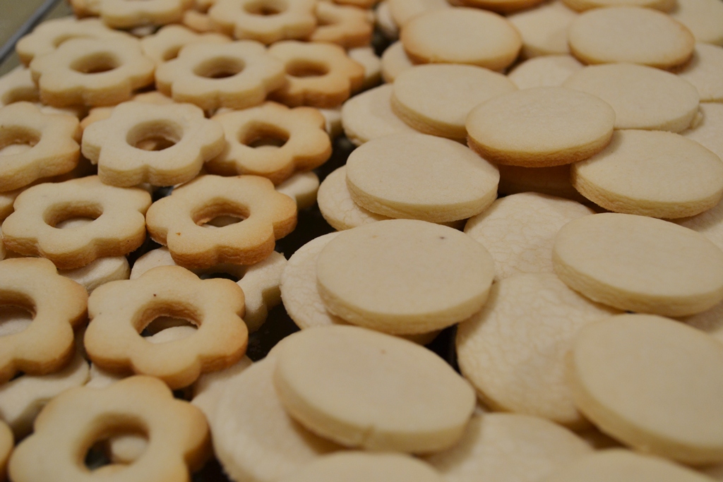 Roll the dough out to about 2mm (thin) and start cutting. Remember to make an equal amount of bottom and tops, so counting is advisable. Place on a baking sheet lined with baking paper. Bake at 180°C for 8 min. You don’t want them really brown, just a little bit.