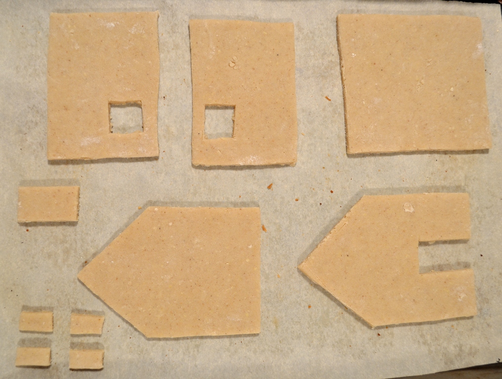 Take the recipe from “Gingerbread cookies” and make the dough. I recommend you let it stand for a week or so, the dough will be much flavourful. While waiting for a week you can make stencils. I highly recommend this so that your walls and so on are straight and fit each other. There is a nice one over at the Saskatchewan German Council webpage: Shapes for Gingerbread house. This might be a bit too big for the regular amount of dough, but you can always a) make more dough or b) reduce the size on the stencils. I also saw gingerbread house cookie cutter at Wiltons: look here. Don’t forget to make a base for your house.