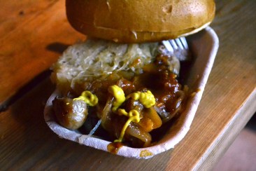 Since Bretzels are not enough for supper (we had no lunch) we looked for a bit more. I heard that there would be Leberkäse, which is meat loaf. My husband got the Currywurst though. Both came with Sauerkraut, which is a bit unusual but was still yummy.