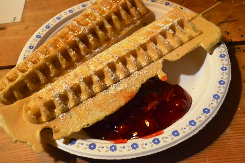 After that you need of course some dessert so we got some waffles. My hubby got one with maple syrup, I got the one with cherries. Other options would have been with whipped cream or chocolate syrup or icing sugar. It was quite yummy and they were on a stick, which is quite genius.