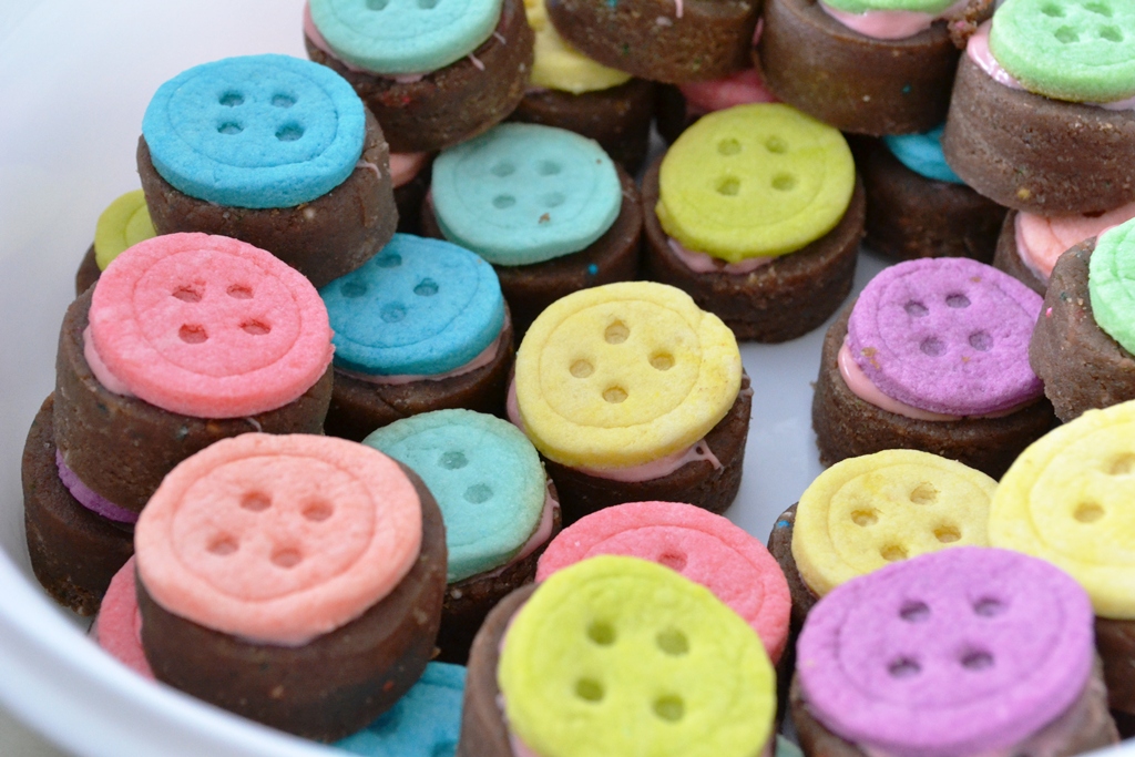 So basically, I made a confetti cake again, mixed it with chocolate frosting and used a round cookie cutter to make the shape. Then I put a bit of chocolate on it and stuck a sugar cookie button on top. Very simple and very effective.