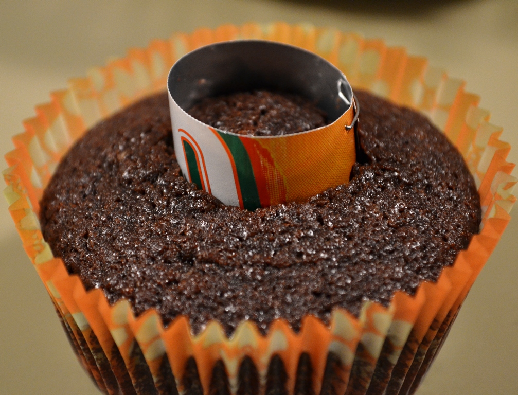 Now to put the whole thing together: take a 1 inch round cookie cutter and cut out a hole. You want to dig in a bit but make sure you don’t hit the bottom. A little spoon will do the trick. Then fill your ganache into a icing bag and fill the hole to the top. Finally, fill the frosting into an icing bag with a tip, I used the 1M from Wilton. Swirl your frosting on and sprinkle with some sugar shamrocks or green sprinkles.