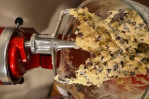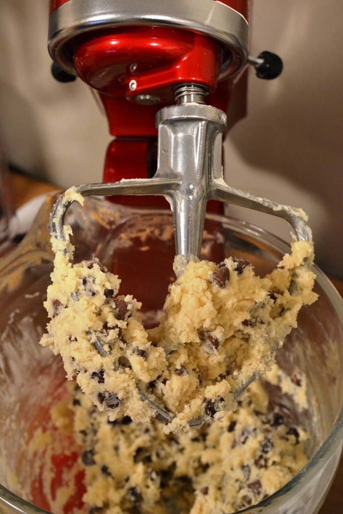 Make sure your butter is room temperature before creaming it. Use the paddle attachment for your stand mixer. If you have a hand mixer the regular attachment will do. Add the sugar to the creamed butter and mix until fluffy. Crack the egg in a cup and whisk before adding to the butter-sugar mix. Then add the vanilla and mix well. Scrape the sides of the bowl once in a while, butter tends to stick there. Mix the flour with the baking powder and add to the rest. Add the chocolate chips.