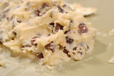 You can use two spoons to make your cookies or you roll them into balls and press them down a bit. I used method two and it worked perfectly fine. Another suggestion the book gives is that you use a cookie press. That won’t work because of the chocolate chips but is a nice idea otherwise. You could also roll a bit, well, roll and cut slices off but you would have to add a bit more flour as the consistency of the dough won’t allow for rolling really.