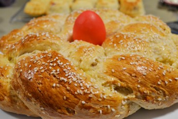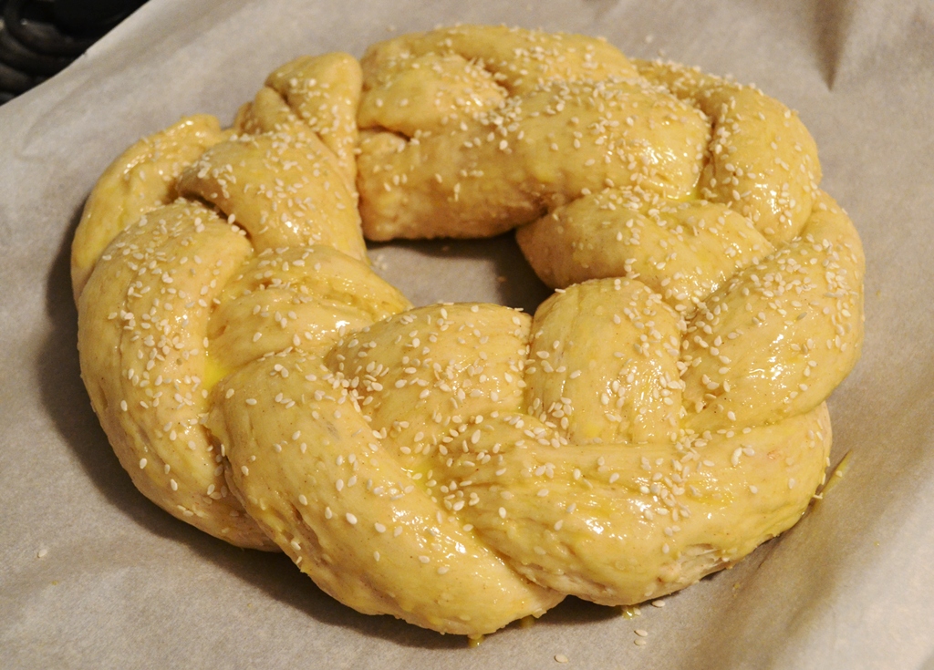After this you part the dough into 3 equal parts and form about 50cm long strands. Braid those and form a wreath. Place on a big cookie sheet lined with baking paper and let it rise again for about 15 min. Then mix the egg yolk with the milk and brush the top of the wreath. Sprinkle the rest of the sesame seeds on top and bake at 200°C of about 35 min.