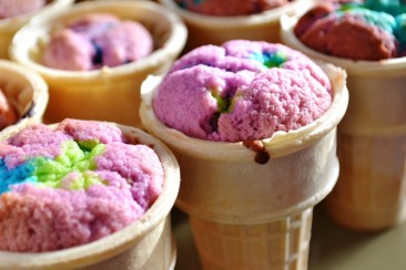 Fill the ice creme cones, alternating colours and make sure you fill them almost completely. It is ok if they have a little bump after baking. If you want you can swirl the different batters with a skewer (a toothpick might be too short) to make it look fancier.