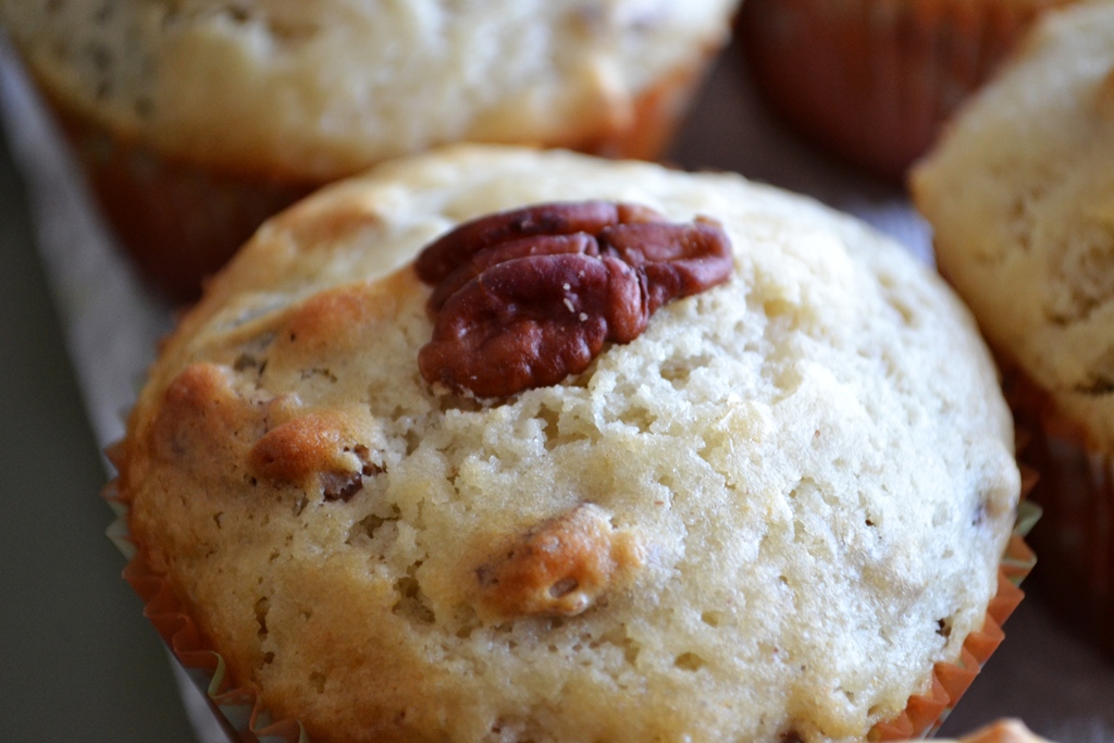 Line your muffin tin with liners or grease with butter and dust with flour. Divide the batter among them equally and place one half pecan on top, pressing it in slightly.