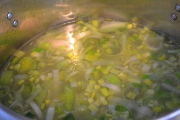 Peel and slice the potatoes, clean and slice the leek. Make sure you have a big enough pot so that the potatoes, leeks and liquid fit reasonable. Bring to a boil and let it cook for about 50 min until everything is soft.
