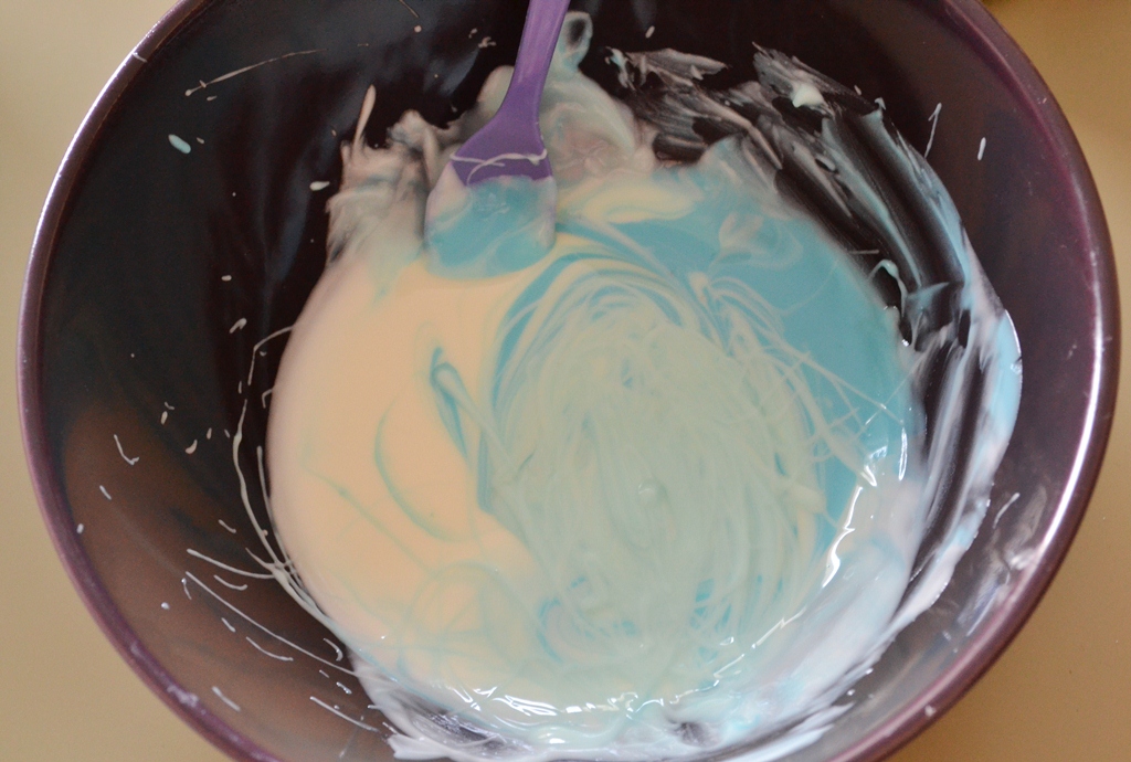 Pour two or more colours into a bowl but make sure they do not mix too much. Take a cake pop and swirl it through both colours and let the additional chocolate/candy coat run off. The first cake pop might not look perfect marbled but it will get better as you go. Use a little spoon to add chocolate/candy coating where needed.
