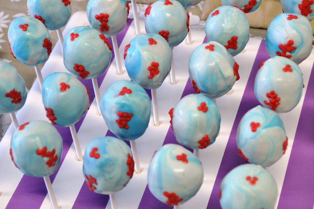 She asked for a raspberry cake and that the cake pops be marbled in blue and white with berries panted on them. I never marbled cake pops before so I had to do a little research to find out how to do that. Thanks to PintSizedBaker I was able to figure out how to marble.
