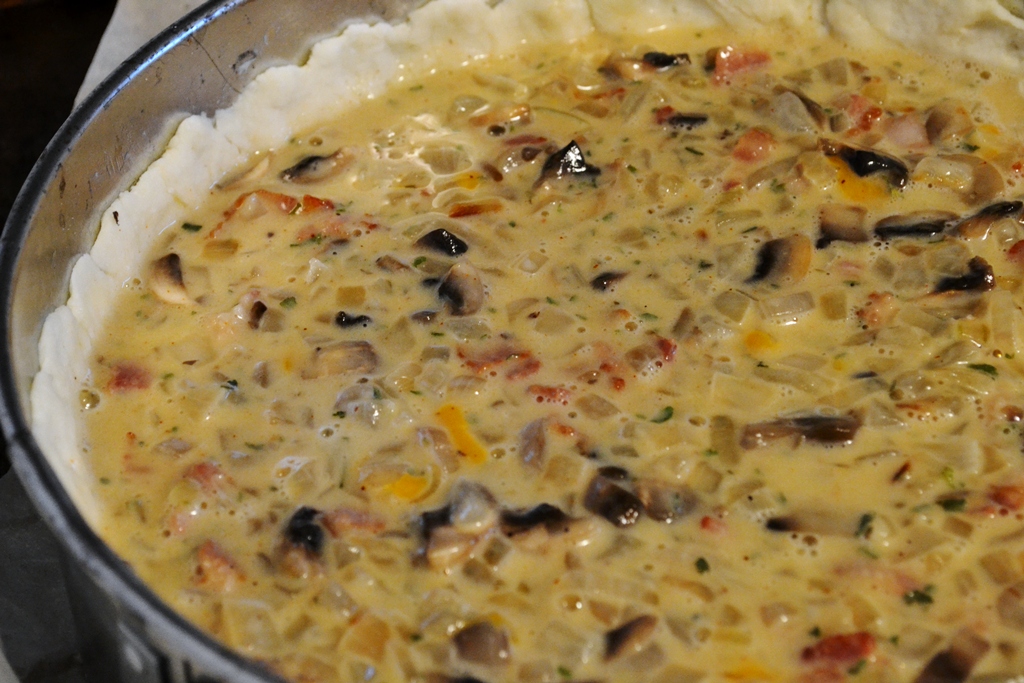 Remove the pan from the heat and let it cool a bit, then mix Crème fraîche with flour in the pan. Mix in the eggs, egg white and cheese, add the coriander and the onion-bacon-mushroom mix. Adjust season if needed and transfer into the springform or tart form and even out.