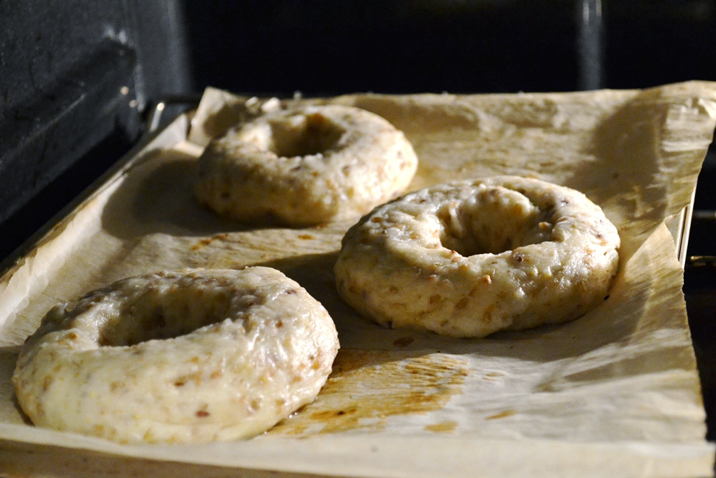 Boil some water and drop each bagel into the water, one at a time, and let it cook until each floats on the surface. Frankly, mine floated right away but I think I gave each at least 10 to 20 seconds. Remove from the water and place on a baking sheet lined with baking paper/parchment paper.