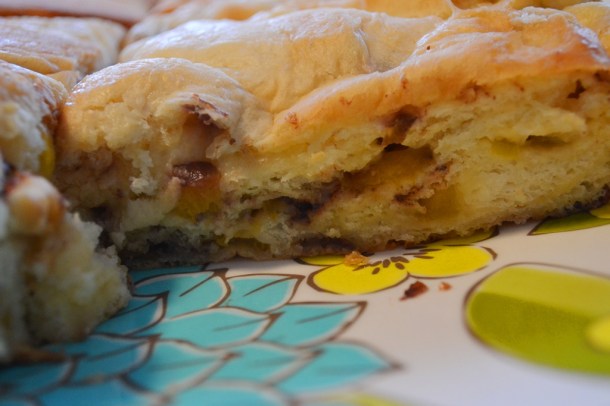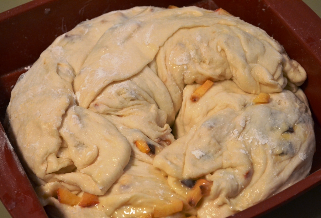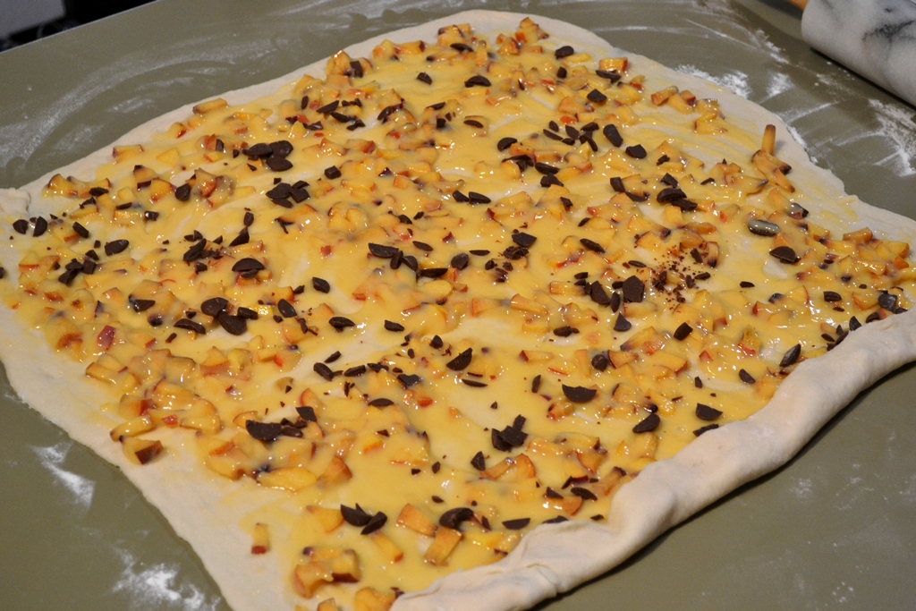 Spread the vanilla pudding-nectarine mixture equally on the dough and sprinkle the diced chocolate on top. Then carefully roll up the dough and cut in half. Twist both halves together, if possible, and place in a baking pan (square or round – greased with butter and dusted with flour or lined with baking paper).