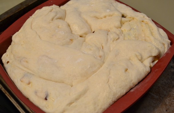 Once the yeast is bubble you add that with the rest of the milk and apple sauce to the mixture and knead until you have a soft dough. Not too long though.