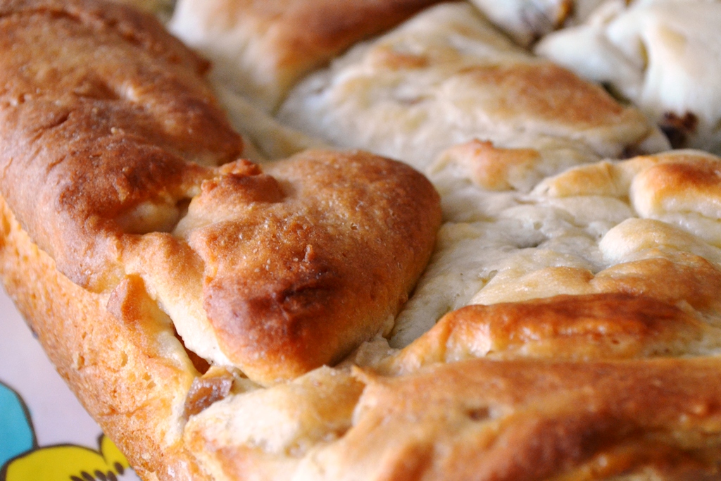 Remove the dough from the bowl onto a surface dusted with flour. Slightly pad it before rolling out into a rectangle. Make sure it is not too thin or the dough will tear when you roll it up.