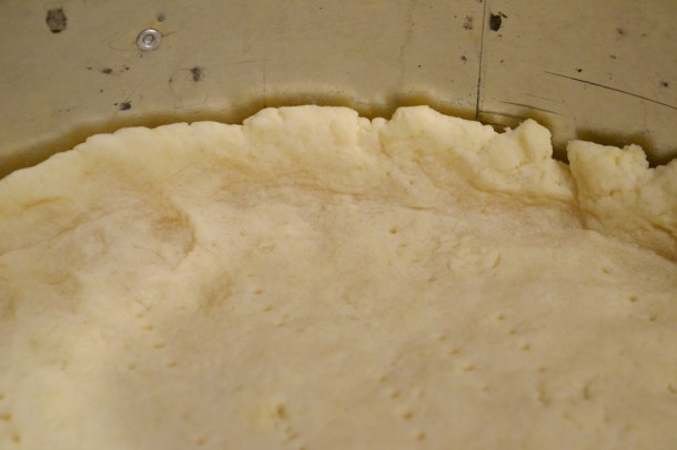 Combine all ingredients to a soft dough, then roll it out on a flour dusted work surface. Line you tart form with it and use a work to poke holes. Bake the “shell” at 200°C for 10 min and remove from the oven.