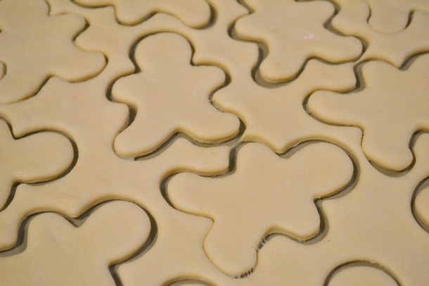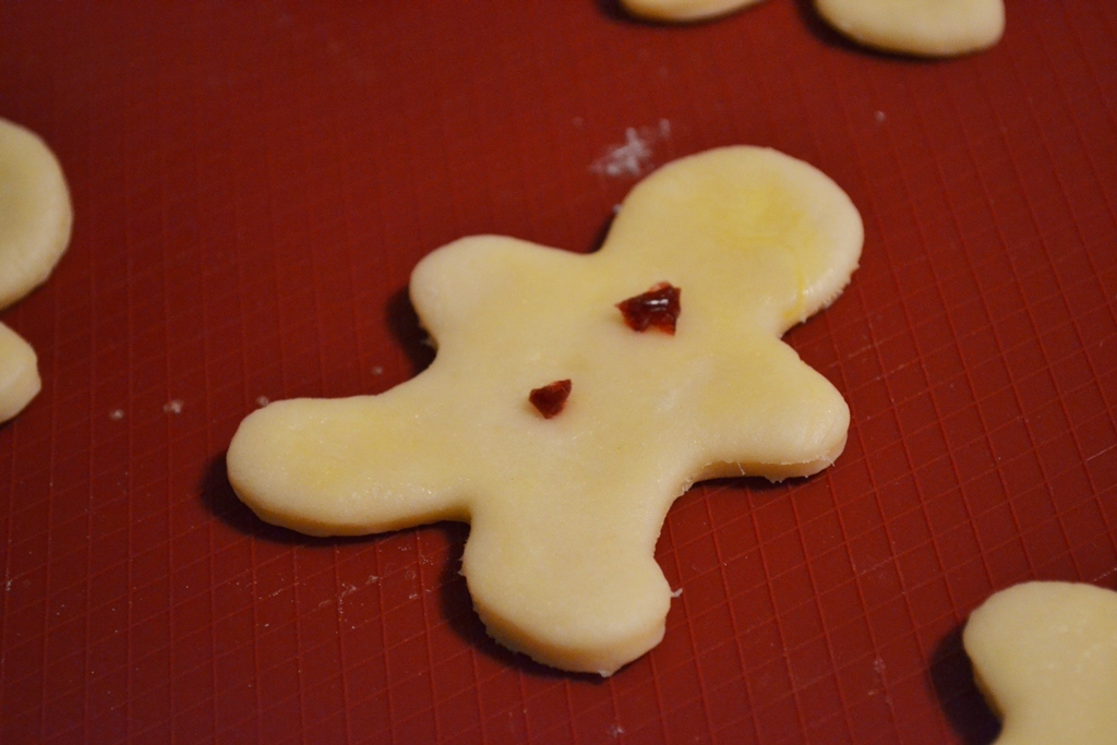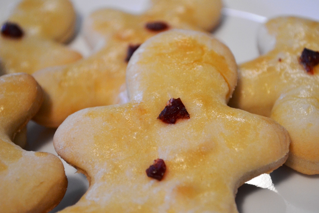 Prepare your working area by cleaning it and dusting it with flour. Line cookie sheets with parchment paper and set them aside. Then remove the dough from the bowl and lightly pad it, then roll it out. Be careful, you don’t want the dough too flat. Use a gingerbread man cookie cutter to cut out your Weckman and place them on the cookie sheet. Then brush each with egg wash and place a piece of raisin or dried cranberries as buttons. Let them sit for another 10 min and bake at 180°C for 15 min.