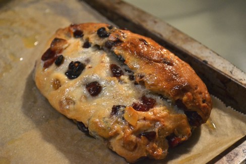 The dough should have doubled after that our and now you can incorporate the nut/fruit mix. Cover again and let it rest for another 30 min before you divide the dough into 8 pieces. Then you need to form a Stollen. This video will show you how to do it: Omi’s Stollen. Start watching at about 6:45 min. Once you have the form, place the 8 Stollen on baking sheets and bake at 170°C for about 40 min. You will need to check in between, if they are browning quickly spray with water and cover with aluminum foil. Check if the Stollen is done by knocking on it. It should sound sort of hollow.