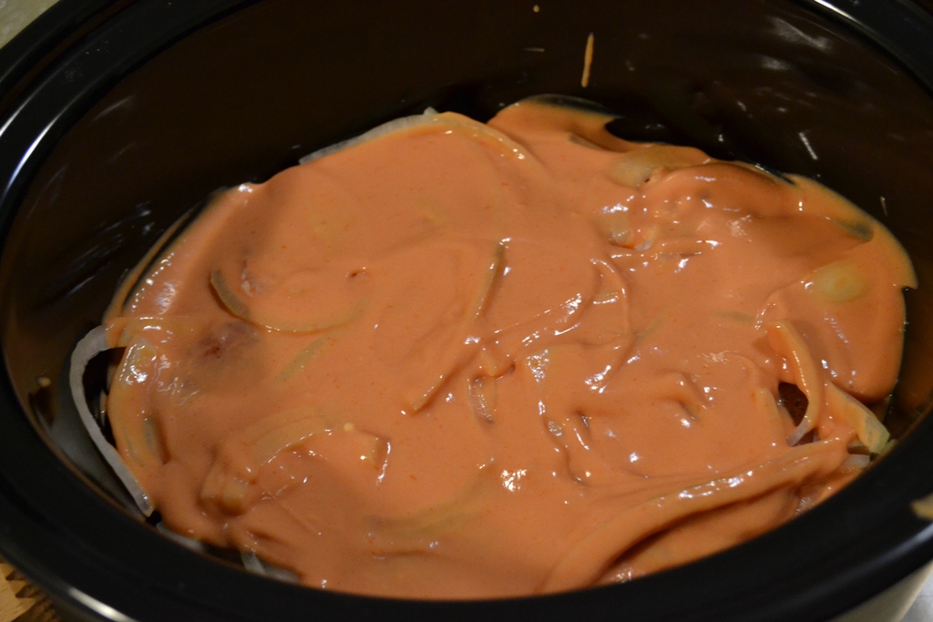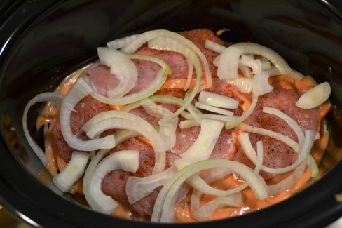 Take out the crock pot and add a bit of sauce/dressing to the bottom so that the meat will not stick to it. Then lay out one layer of pork filets, “sprinkle” with onions and add more sauce/dressing to cover it up. It doesn’t have to be completely cover though. Repeat steps until all meat is used.