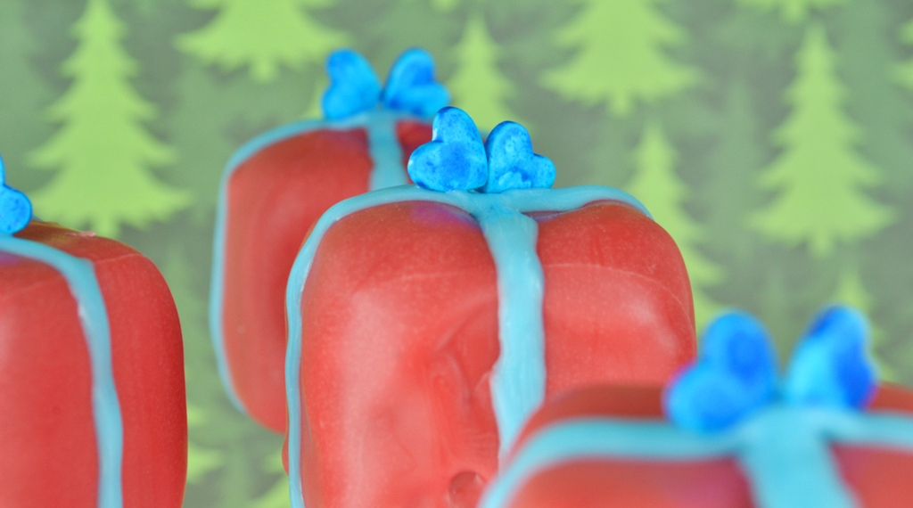 Proceed with dipping and cooling until you have the present on the stick and ready to decorate. You could use fruit strips to shape the bow, if they are very flexible. I painted the ribbon on the present and then added the hearts to shape the bow. Very simple but effective.