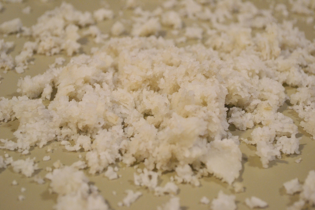 Cooked the potatoes in their skin for about 40 min or until they are soft and you can easily pierce them with a fork. Remove from the water and let them cool so that you can peal them. Rice the potatoes with a potato ricer or use a meshed sieve. Careful: a meshed sieve might discolour the potatoes due to the metal. This happen to me but I would say it depends on the quality of the sieve. Spread the riced potatoes so that as much surface is exposed as possible. Let cool completely.