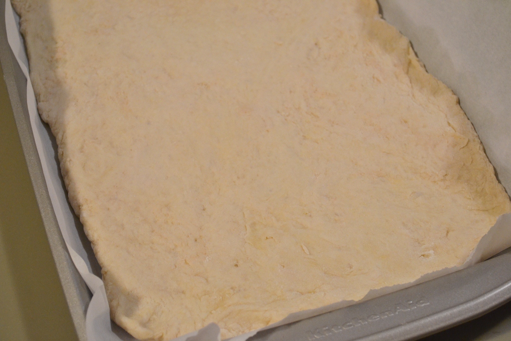 Preheat the oven to 225°C then flour the working area and roll out the dough into a square that fits your cookie sheet. The sheet should have a bit of a rim. Line it with parchment paper and place the dough on the cookie sheet. Then melt the butter and spread it equally on the dough. Cover the sheet and let it rest in a warm spot for another 15 min.