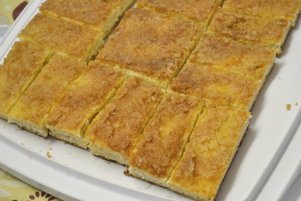 Combine the sugar with cinnamon and sprinkle equally over the buttered dough. Then bake the cake for 15 to 20 min.