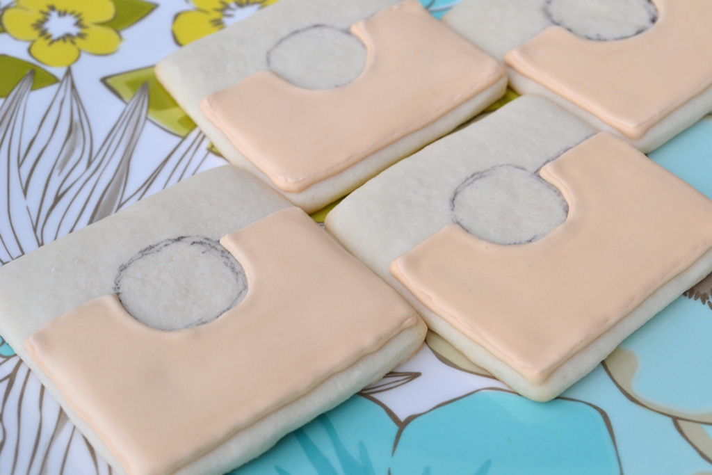 I started with the bottom half of the logo and outlined the lens with a black edible marker so I would know where to go. There was a debate if I should not do the bottom and top part first and draw the lens on top. If I do those cookies again I believe I would do that. This time however, I didn’t. After the outline the bottom part was flooded and left to dry. I am not sure how long it too, but several hours seems to be the norm. The top part was outlined with dark brown and flooded as well, which was then followed by the black lens.