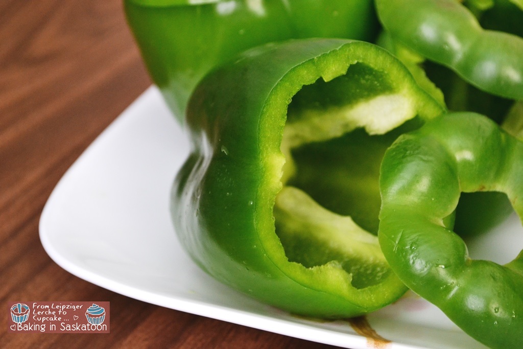 First, prepare the bell peppers. I usually use green ones, but if you prefer red, yellow or orange, by all means. Cut off the top, clean out the center and the stem from the top and wash all. Set aside.