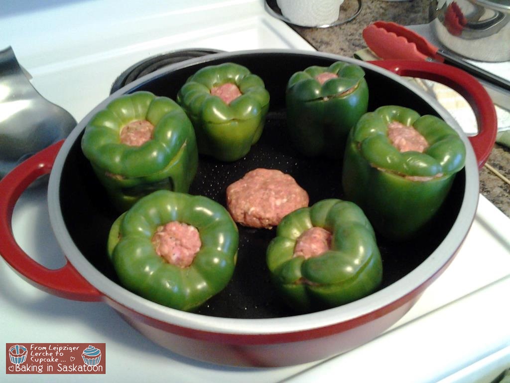 Combine ground pork and ground beef, add the egg, diced onions, salt, pepper, and paprika. I like to use ketchup and mustard for flavouring, but that is up to you. Combine everything well. Then stuff the bell peppers with the meat and press the top back on. Secure with some toothpicks to they will not fall off. Make patties of the left over meat, if you have any.