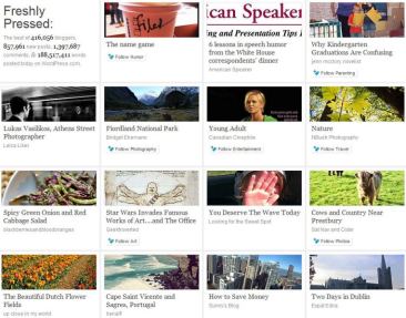 The first thing you will notice when going to WordPress is their front page with the “Freshly Pressed” blogs. At first, I didn’t quite understood this but thought it was nice. Several topics are always presented, like travel, food, books, movies etc. It’s interesting to see what is out there, what people write about and what moves them. This was before I had my own WordPress account.